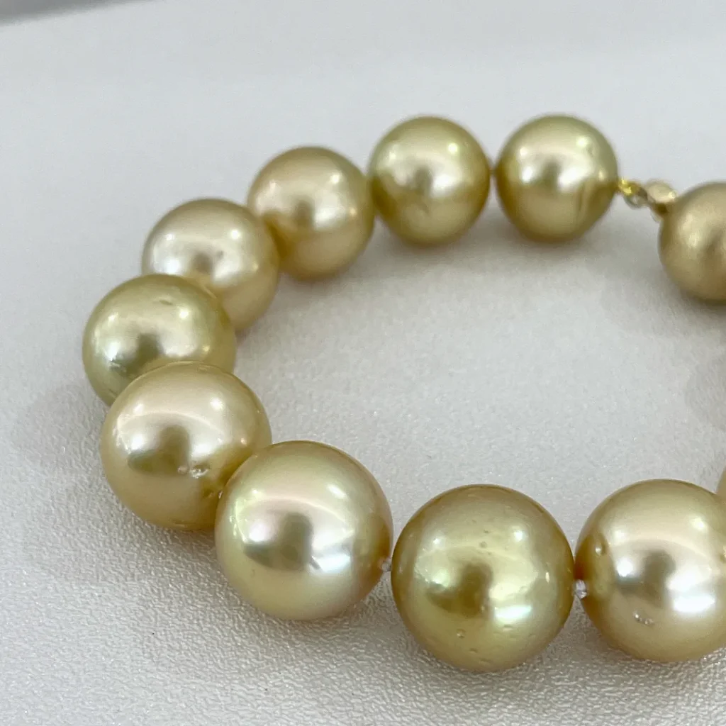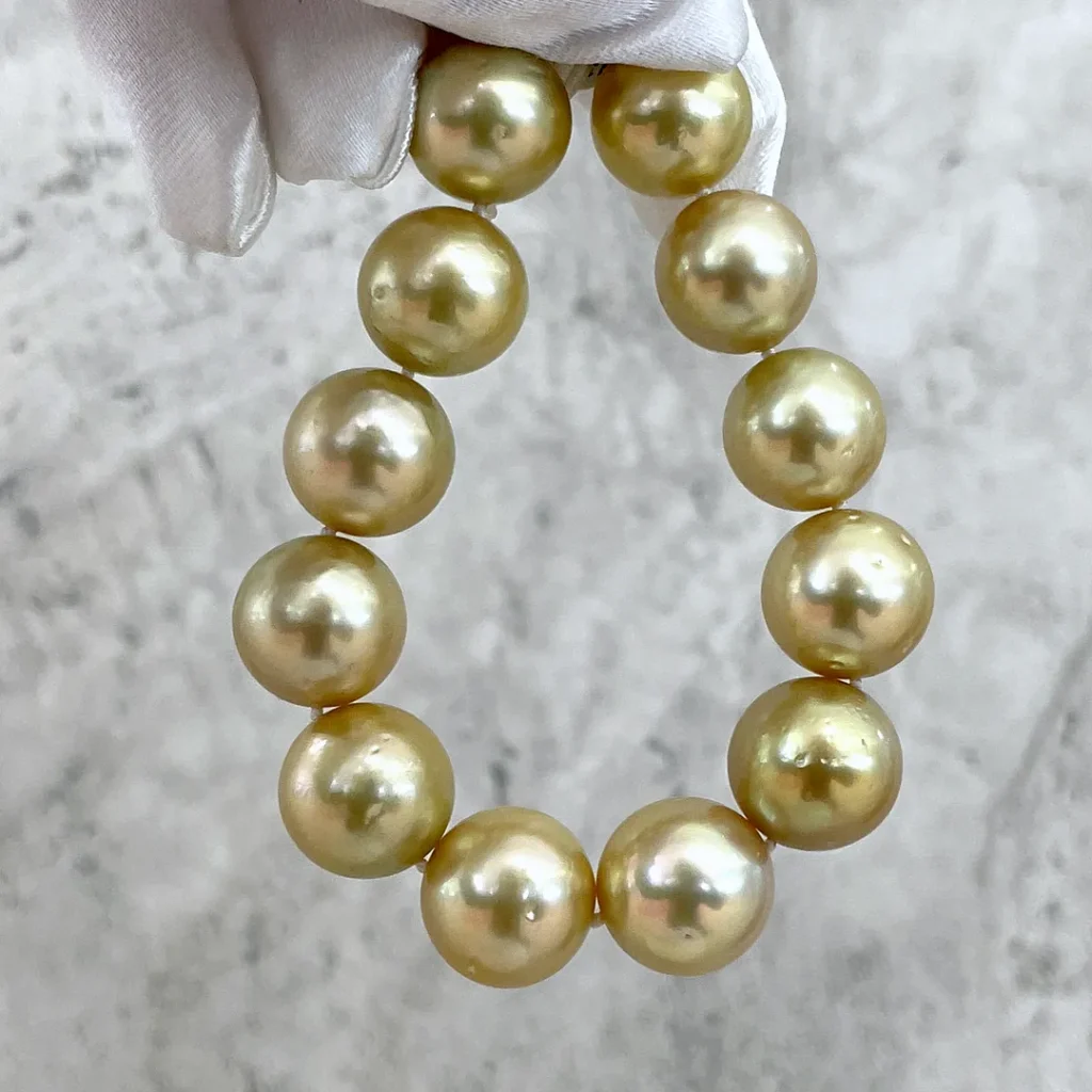 This Golden South Sea Pearl Bracelet showcases 12 high quality near – round pearls sized in 13.1 – 14.2mm, with rich, warm golden lusters. Crafted with 14K yellow gold accents, it radiates luxury. The pearls’ substantial size and luminous sheen make it a standout piece, ideal for adding elegance to any ensemble. A perfect fusion of opulence and sophistication.