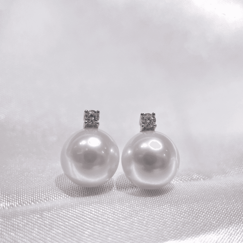 A classic and elegant pearl and diamond stud earrings. Two 8.5-9mm AAA Quality White Japanese Akoya Pearls are peg set and sit on beautiful 18k gold scalloped settings.