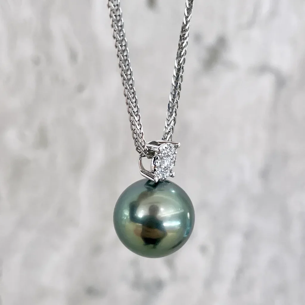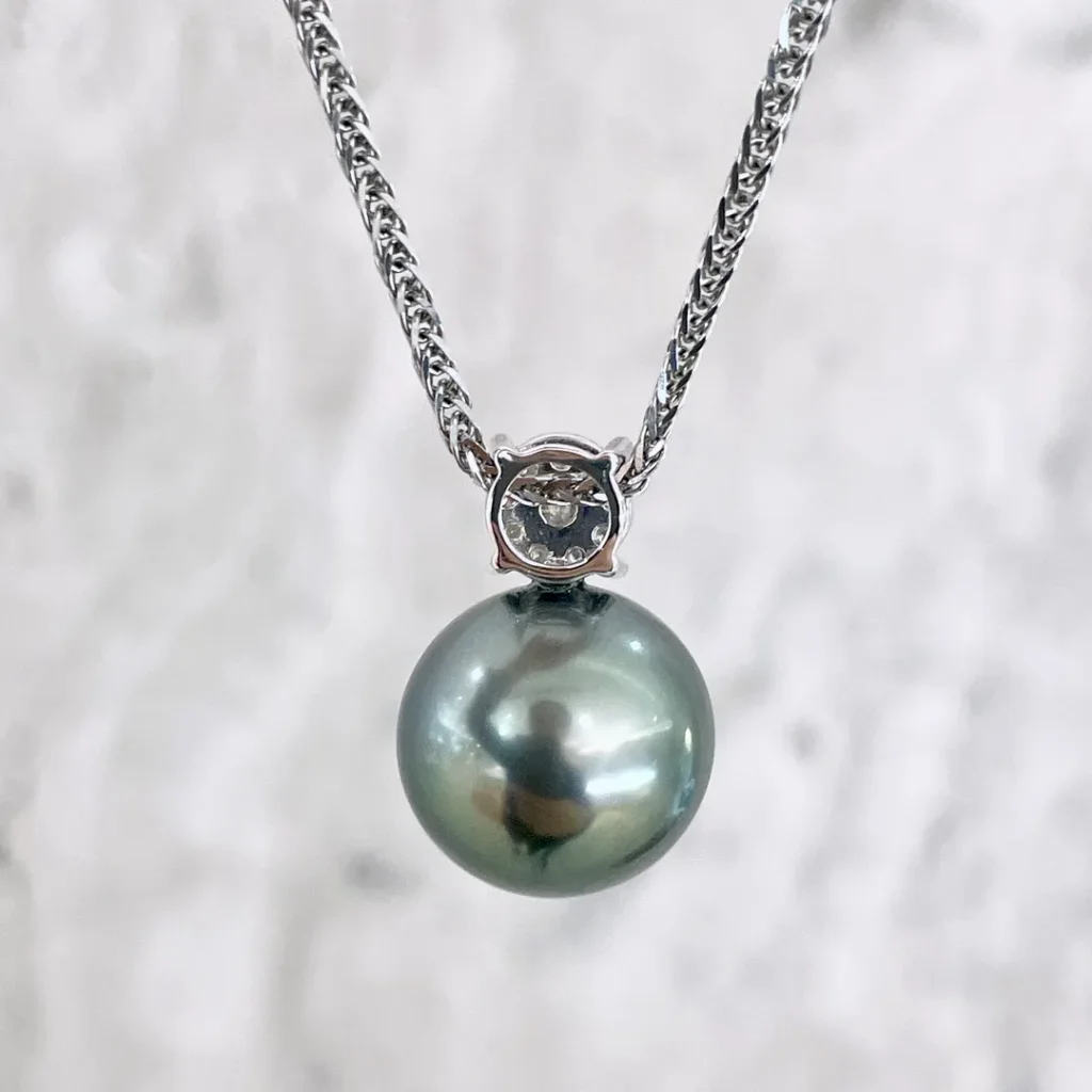 This Black Tahitian Pearl Diamond Accent Pendant features a 15mm round black Tahitian pearl, renowned for its deep, iridescent sheen with hints of green and blue. Set in 18K white gold, the pendant is topped with a cluster of sparkling diamonds arranged in a radiant, floral – like pattern. The cool, sleek white gold beautifully complements the pearl’s mysterious luster, while the diamonds add a touch of brilliant sparkle, creating a timeless piece that exudes elegance and sophistication.