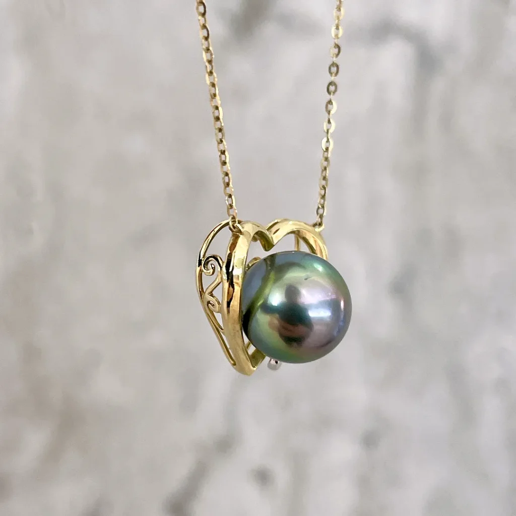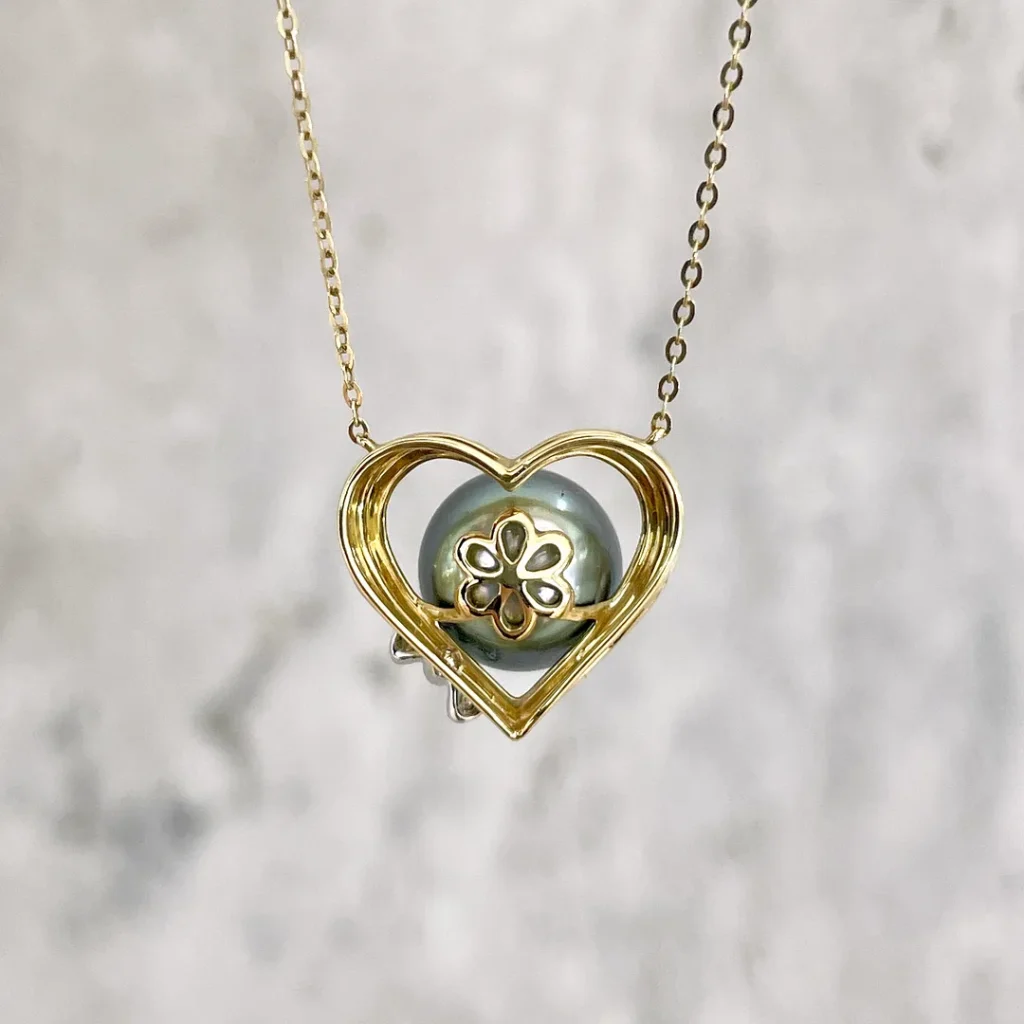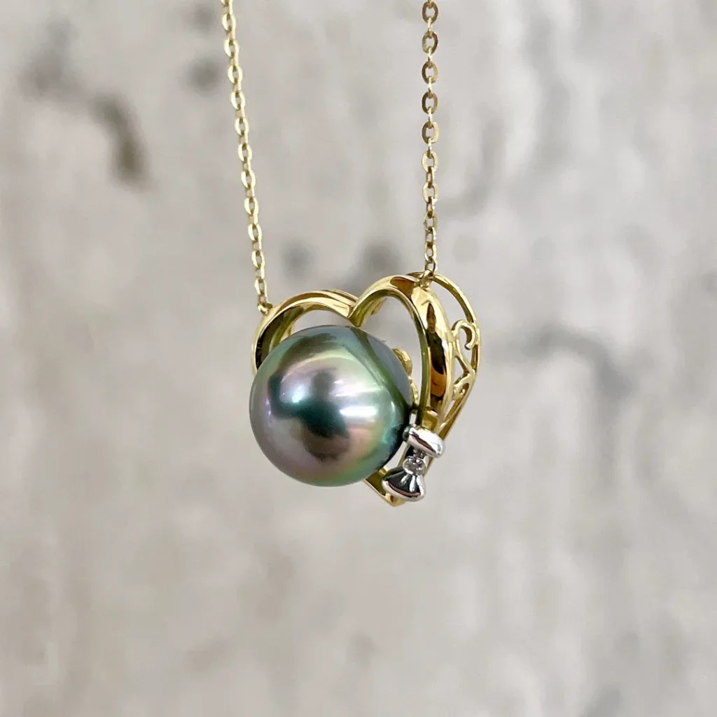This pendant features a 9.8mm round black Tahitian pearl, known for its deep, iridescent luster with hints of green and purple. Nestled in an 18K yellow gold heart – shaped setting, the pearl is “embraced” with elegance. Accented by 18K white gold details with sparkling diamonds, the design blends the pearl’s dark allure with the warm glow of yellow gold and the brilliance of diamonds, creating a romantic and luxurious piece.