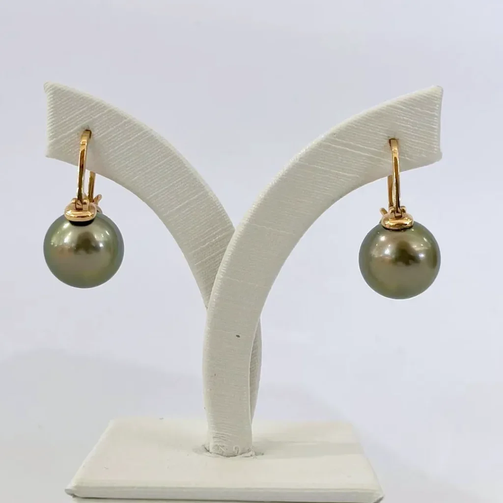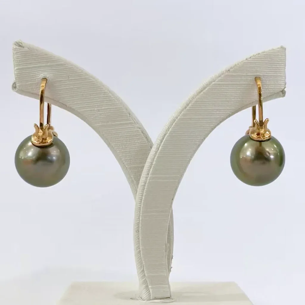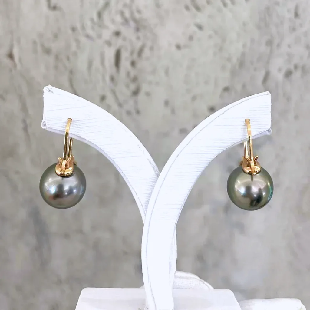 These black Tahitian pearl hoop earrings showcase exquisite craftsmanship. Each earring features a round black Tahitian pearl with a size ranging from 10 to 10.5mm. Black Tahitian pearls are renowned for their captivating dark hues, often with subtle overtones that add depth and allure.The pearls are elegantly suspended from 14K yellow gold hoops.The combination of the lustrous black pearls and the rich yellow gold creates a striking contrast, making these earrings a timeless and sophisticated accessory suitable for both formal occasions and adding a touch of elegance to everyday wear.