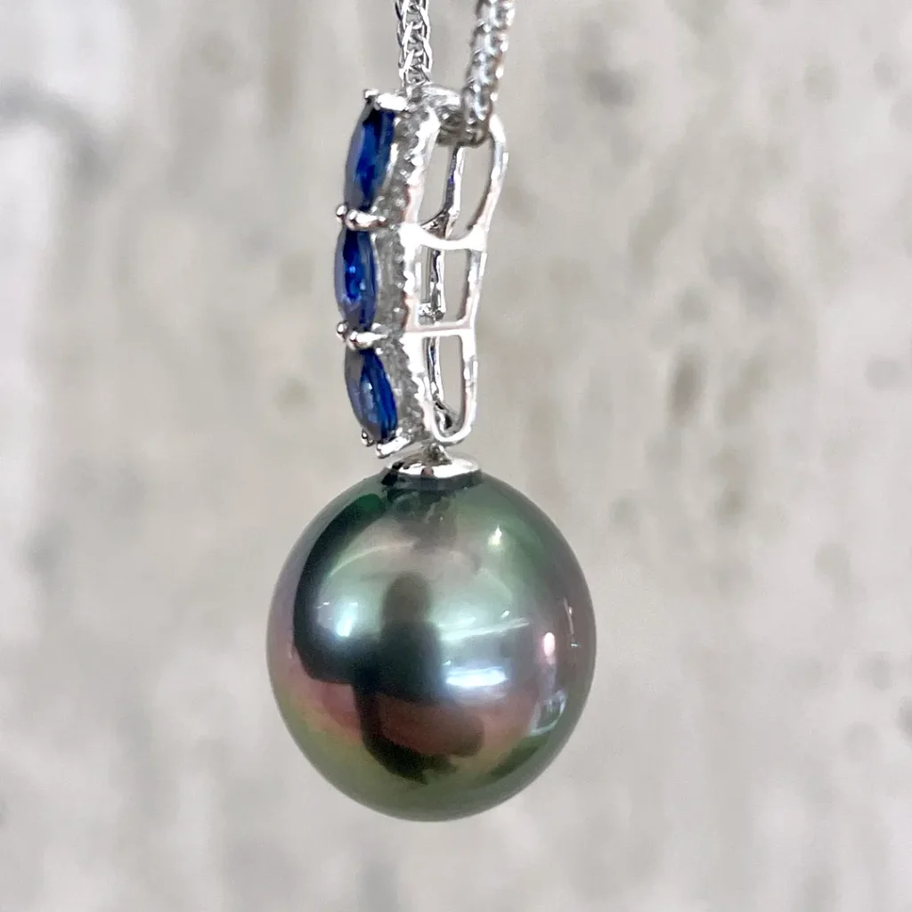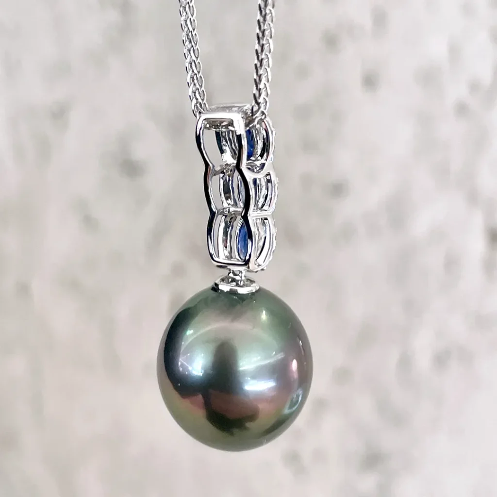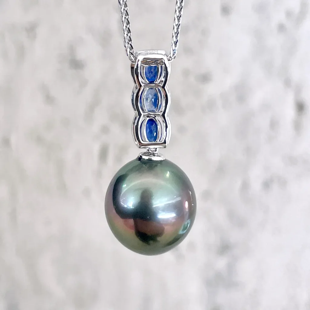 This pendant showcases a 14.2mm oval black Tahitian pearl, celebrated for its deep, iridescent luster with mesmerizing hues. Set in an 18K white gold setting, it features three vibrant blue sapphires arranged vertically, each framed by sparkling diamonds. The rich blue of the sapphires, the dazzling diamonds, and the sleek white gold beautifully complement the pearl’s dark, alluring glow, creating a sophisticated and eye – catching piece that embodies elegance and luxury.