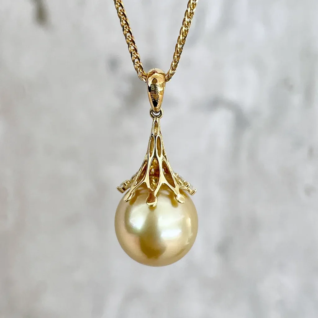 This exquisite pendant showcases a single 12.4mm Golden South Sea pearl, celebrated for its rich, natural golden hue and exceptional lustre. The pearl is gracefully set in an 18K yellow gold filigree design setting, with delicate filigree details that add elegance and sophistication. Its thick nacre gives the pearl a mirror-like surface and radiant glow. Suspended from a matching gold chain, this pendant embodies timeless luxury and refined craftsmanship, making it an ideal piece for both everyday elegance and special occasions.