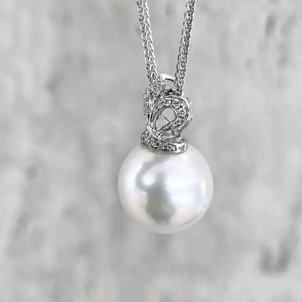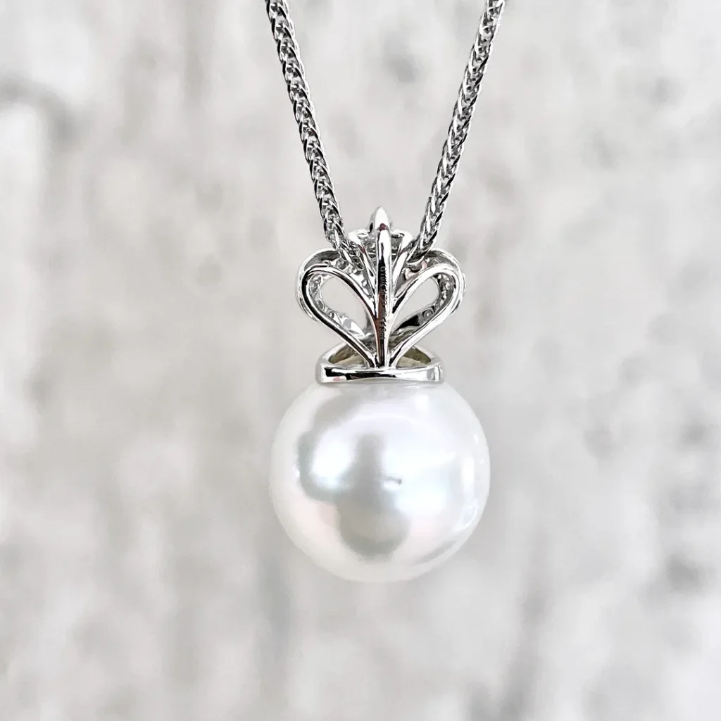 This pendant features a stunning white South Sea pearl, celebrated for its large size in 13.7mm, round shape, and ethereal, luminous white sheen that seems to glow from within. The pearl is elegantly suspended from an 14K white gold setting crafted into a regal crown design. This crown is intricately adorned with a multitude of sparkling diamonds, which catch the light beautifully and enhance the pendant’s overall grandeur. The combination of the pearl’s pure, celestial radiance and the diamond-encrusted crown creates a piece that exudes royal elegance, timeless beauty, and the unparalleled allure of one of nature’s most precious gems. Perfect for special occasions, this pendant is a masterpiece that blends exquisite craftsmanship with the inherent charm of South Sea pearls.