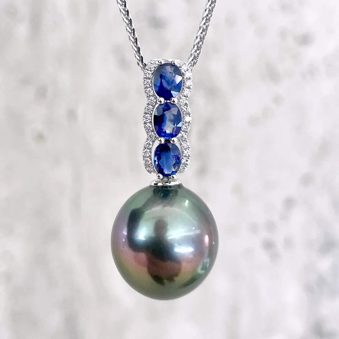This pendant showcases a 14.2mm oval black Tahitian pearl, celebrated for its deep, iridescent luster with mesmerizing hues. Set in an 18K white gold setting, it features three vibrant blue sapphires arranged vertically, each framed by sparkling diamonds. The rich blue of the sapphires, the dazzling diamonds, and the sleek white gold beautifully complement the pearl’s dark, alluring glow, creating a sophisticated and eye – catching piece that embodies elegance and luxury.